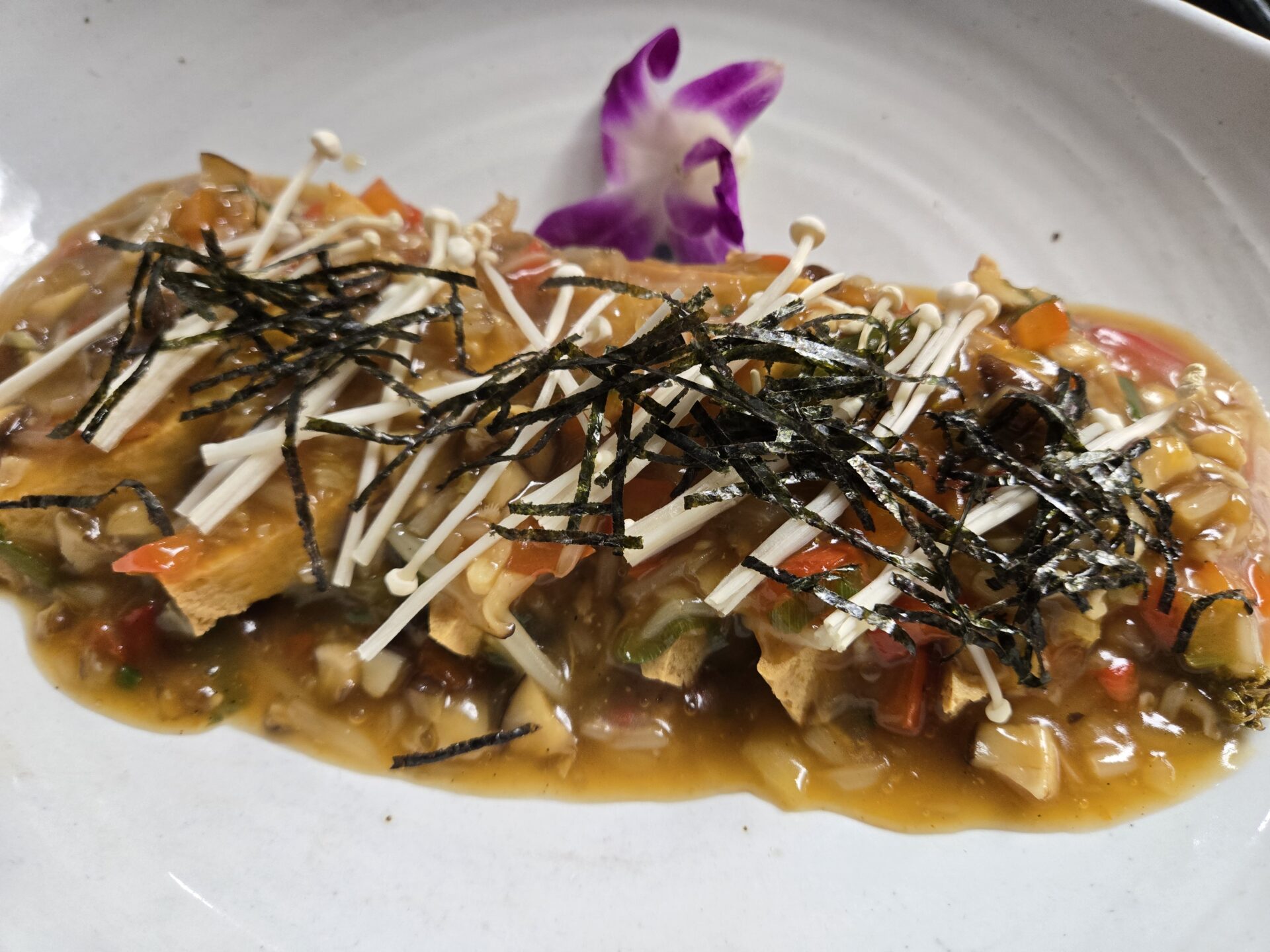 Steamed eggplant and red bell pepper in a savory garlic sauce
